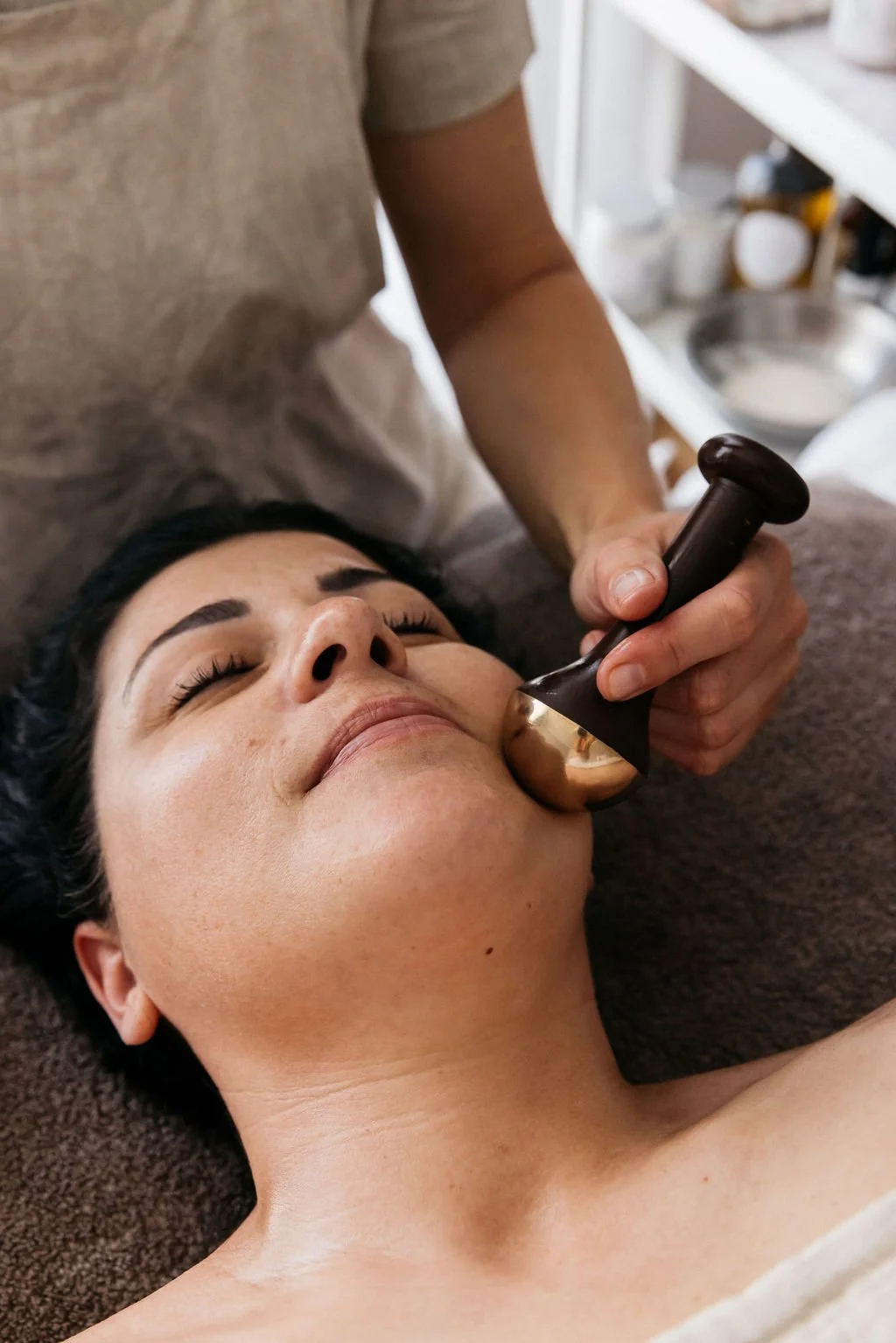 Your treatment begins with warm herbal compresses to open the pores and relax facial tension. A customised blend of Ayurvedic botanicals and dosha-balancing oils is then massaged into the skin using traditional marma-point techniques. These gentle, rhythmic strokes stimulate circulation, release stagnation, and encourage the skin’s natural detoxification.